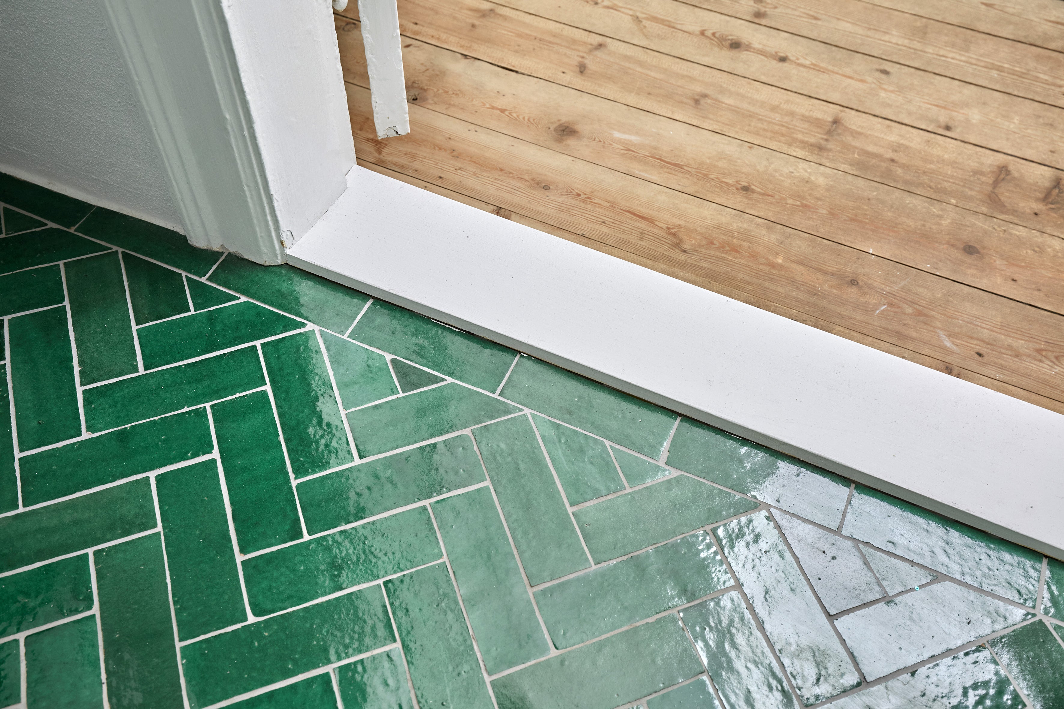 Vores andet fugeforslag til Zellij Fez Green. Valg af fugefarve har stor betydning for det endelige udtryk, og der er mange muligheder. Ofte er et dæmpet udtryk at foretrække, hvor fugefarven matcher flisens farvetone eller er lidt lysere.