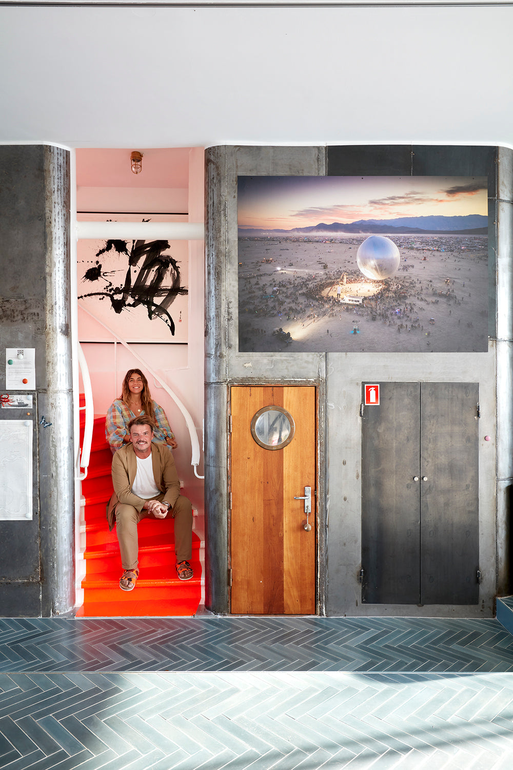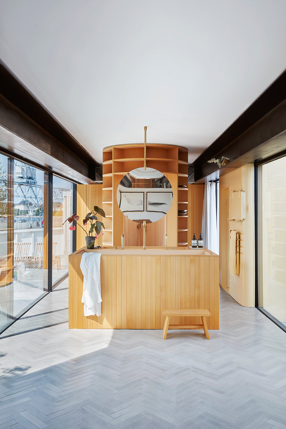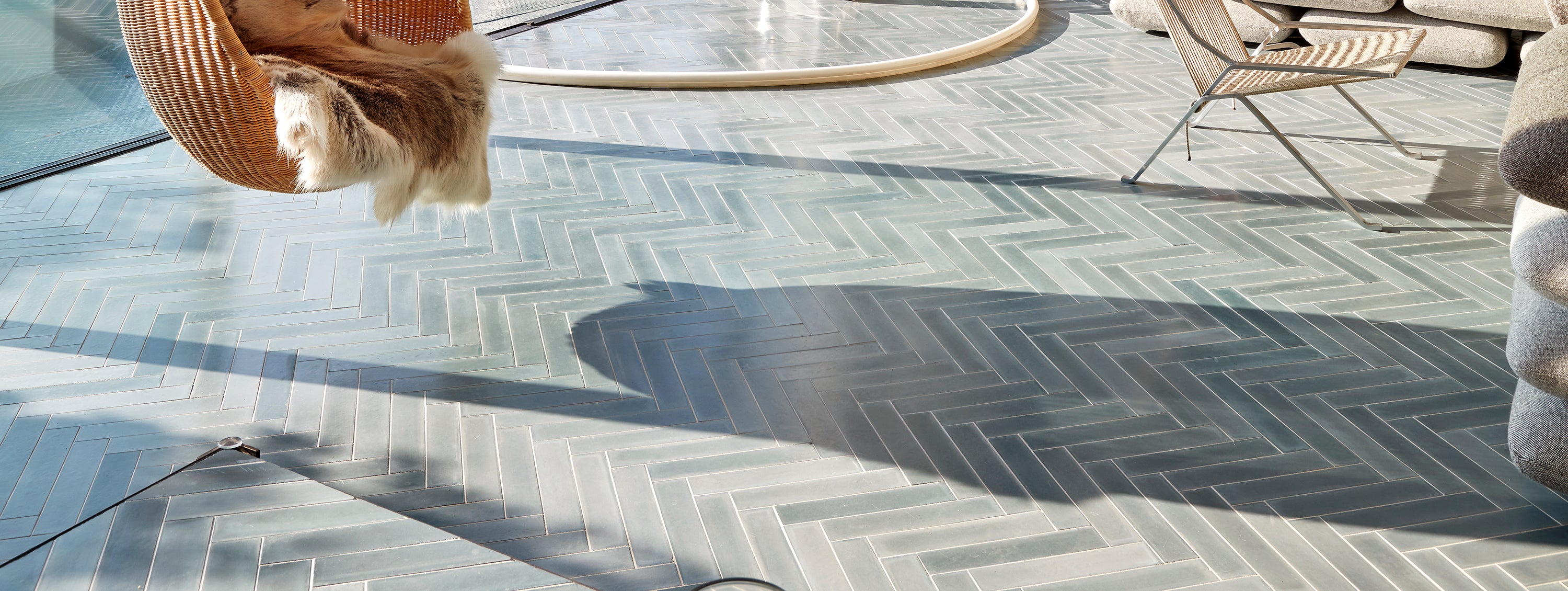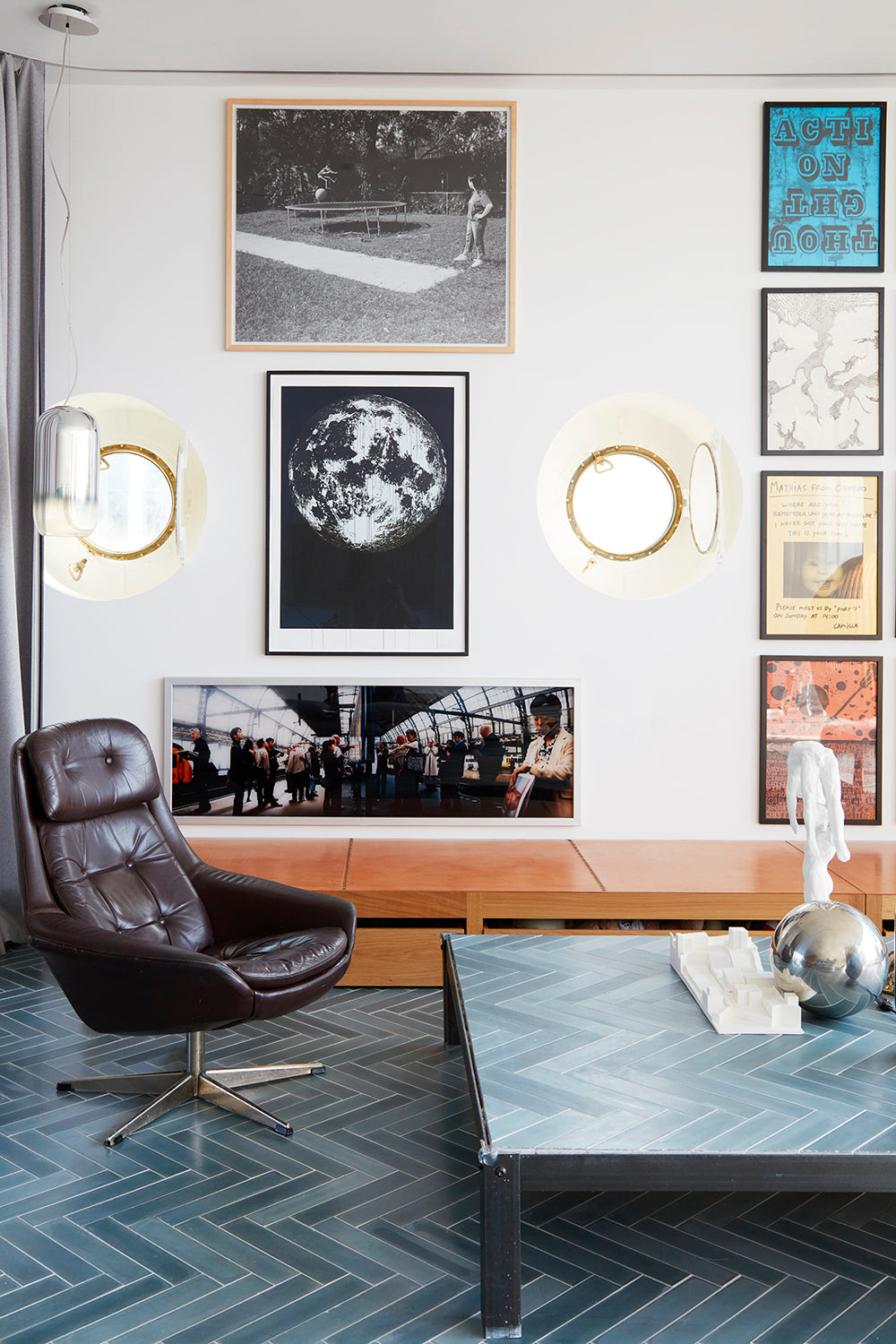 Transformationen af den gamle ø-færge til en unik, moderne bolig er sket med lige dele fremsyn og tradition. Bådens metal-vægge harmonerer med cementflisernes rå og industrielle beton-overflade. De store koøjer med havudsigt skaber en forbindelse mellem vandet og den blå stavflise, “STIX North Sea”. Oppe på “broen” på 1. sal ligger soveværelset med lysegrå cementfliser i en lysere og varmere tone, og med udsigt over Københavns vand.